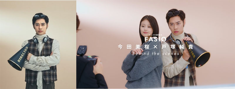 ブランドミューズの今田美桜さんと共演するスペシャルムービーが、特設サイトと公式SNSで公開中。CMディレクターTOZUKAは、新商品「BB ティント UV カバー」の高いカバー力を表現するため自らの肌に塗って水を吹きかけたり、「うるおい整う クリーム下地」のしっとりとした使い心地をくねくねと全身で表現したり、今田さんを戸惑わせる一幕も。「よ~い、FASIO」の合図で女優モードになった今田さんに「ブラボー…」と涙を見せるなど、ユーモラスな内容です。