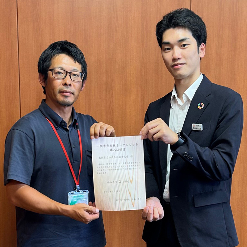購入したのは、「一関市有林J-クレジット」。担当の一関市農林部林政推進課の佐藤紳也さんは、「昨年から販売を開始した森林由来のクレジットで、購入費は森林の間伐や下草刈りなどの保育活動・森林保全、担い手の育成などのために活用されます。CO2を吸収してくれる森林を育成することで、CO2削減に貢献できる制度となります。現在は企業からの購入が多いですが、今回のようなイベントでの活用は一関市では初のケース。この制度を使うことで誰でも気軽に地球温暖化防止に貢献できるので、まずはJ-クレジットのことを知ってほしい」と願っています。東北電力岩手支店地域共創本部の長谷部大地さんは、「今回のJ-クレジットの活用は弊社として初の試み。以前から気候変動対策として様々な取り組みを進めていますが、その中でJ-クレジット購入によって地域の森林保全およびCO2削減に取り組むことが、地域課題の解決に貢献できるのではと考えました。今後は社内でもJ-クレジットの周知を図り、どのようなケースで活用を増やしていけるか、そして何より継続的な活用を模索していきたい」と話しました。