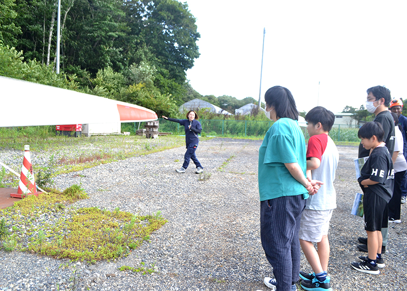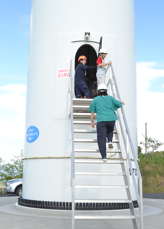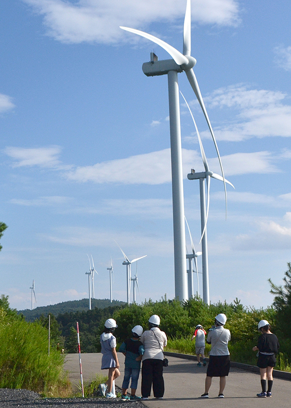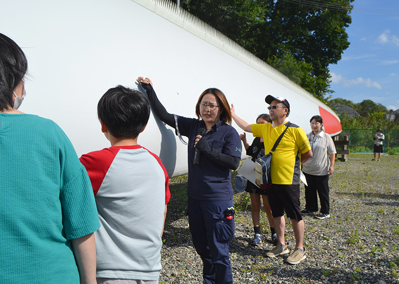 ツアーの目的地は、住田町と遠野市にまたがる県内最大級の風力発電所「グリーンパワー住田遠野風力発電所」。野外に展示された実物大のブレード(風車の羽根)を見学した後、山の上にある風車を間近に見物。参加者らは高さ114メートルもあるタワーを見上げ、その迫力に驚いていました。