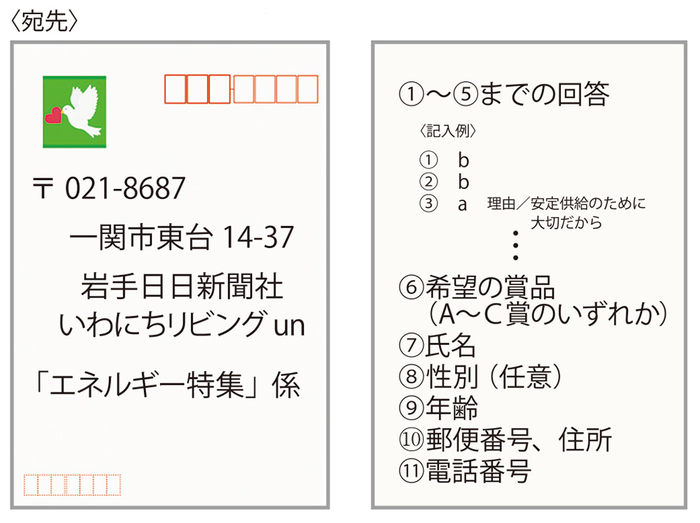 ※応募いただいた個人情報は、賞品の発送にのみ使用します。当選の発表は、賞品の発送をもって代えさせていただきます。なお、賞品は岩手日日新聞社または、賞品提供の会社から直接発送します。※個人情報は岩手日日新聞社が責任を持って管理します。利用目的は、抽選商品の配送に係る業務(商品提供先、配送業者に対する情報の提供)、および個人を特定しない形でのマーケティングのための各種統計に使用します。ただし、アンケート⑤の設問でa. 希望するとされた方に限り、東北電力と個人情報を共有させていただきます。(以下注意事項)