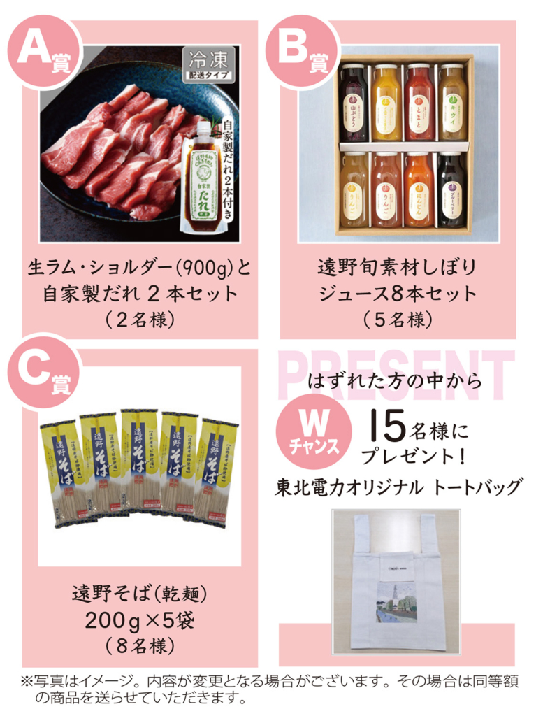 紙面をご覧の上、アンケートに回答いただき、ハガキまたは応募フォームから応募ください。アンケートに回答いただいた方の中から抽選で15名の方に遠野のお土産をプレゼントします!さらに、外れた方の中からWチャンス賞として「トートバッグ」を抽選で15名様にプレゼントします!