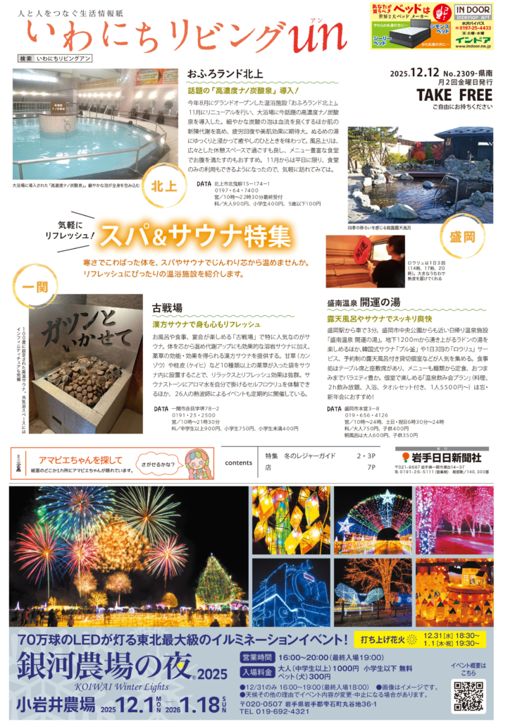 いわにちリビングun 12/12号発行しました♪ 2025 12/12 お知らせ 2025.12.12 紙面スタイルはこちらをクリック♪ 今回の特集は「スパ&サウナ」「冬のレジャーガイド」の2本立て。 寒さでこわばった体を、スパやサウナでじんわり芯から温めませんか。リフレッシュにぴったりの温浴施設を紹介します。 お知らせ いわにちリビング 岩手県 この記事が気に入ったら フォローしてね! Follow @najotta_news Follow Me よかったらシェアしてね! URL Copied! URL Copied! いわにちリビングun 11/21号発行しました♪ 関連記事 ボリューム満点の日替わり定食が人気 Kitchen Harakichi(キッチン ハラキチ) 2024.11.27 いわて蔵ビール「レッドエール」 2年連続でスタイル別世界1位 2022.09.07 新多シンと岩手でフォトスタンプラリー シンカリオンZとコラボ、限定グッズ付きツアー 2022.02.17 いわにちリビングun 4/25号発行しました♪ 2025.04.25 いわてラーメンフェスタ 10月4~6日、盛岡で 2024.10.02 花ことば メルテンシア・マリティマ 2025.04.14 夏休みは親子で地方留学も 新社名「雨風太陽」 都市と地方をかきまぜる! 2022.05.03 一関・松島・美里をドライブ♪ 自然満喫スタンプラリー 5月31日まで 2024.03.06
