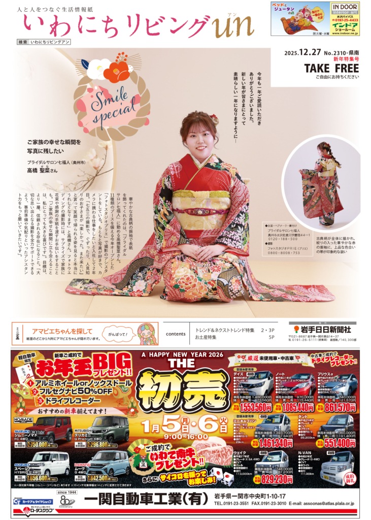 いわにちリビングun 12/27号発行しました♪ 2025 12/27 お知らせ 2025.12.27 紙面スタイルはこちらをクリック♪ 今回の特集は2本立て! 【トレンド&ネクストトレンド】これまでの変化を振り返りつつ、次に来るトレンドを大特集。地元企業の方に住宅と旅、それぞれのテーマでお話をお聞きしたほか、書店員さんからは、今年最も売れた書籍ランキングを紹介していただきました。 【お土産】新年のあいさつに、帰省のふるさと土産に、帰省できない家族にも、地元らしいおいしさを届けませんか。遠くの人にも、地元の人にも喜ばれるふるさとの味を紹介します。 お知らせ いわにちリビング 岩手県 この記事が気に入ったら フォローしてね! Follow @najotta_news Follow Me よかったらシェアしてね! URL Copied! URL Copied! いわにちリビングun 12/12号発行しました♪ 関連記事 ブラジルの家庭料理 ビナグレッチ 2025.09.30 4月21日は「小岩井 生乳(なまにゅう)100%ヨーグルト」の日! 日本記念日協会認定 2024.04.21 みんなで乾杯! 地ビールフェス(8/22~24)に向けガイドブック発行 2025.08.16 東北新幹線開業40周年記念し限定グッズ 沿線のNewDaysなどで販売 2022.06.23 いわにちリビングun 12/2号発行しました♪ 2022.12.02 大戸屋×ハイキュー!! イオンタウン釜石店にキャラクターパネル登場 2025.10.09 東北進出第1号「私のプリン 桜店」 盛岡限定プリンも 2023.04.05 #大谷選手ファミマおむすび割 ホームランか勝利投手でクーポン配布 2025.03.19