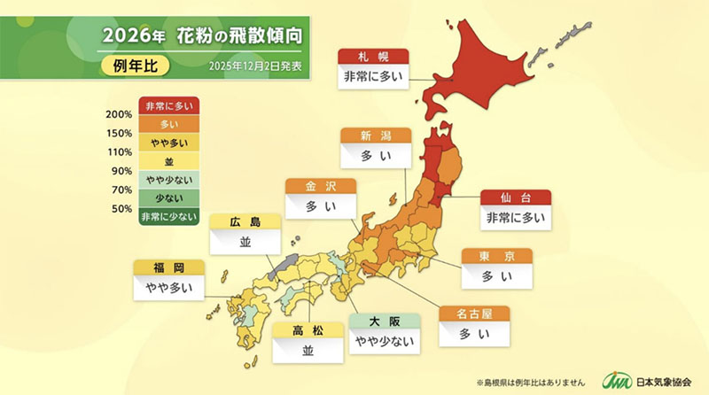 日本気象協会によると、2026年春の花粉飛散傾向は、東北6県のうち宮城、秋田、青森は例年の2倍以上の「非常に多い」、岩手、山形、福島は1.5倍以上の「多い」となる見込み。飛散開始時期は例年並みで、東北では2月下旬から本格的な花粉シーズンに突入すると予測されています。