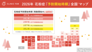 クリニックフォア医師によると、花粉症は1月頃からの早期治療が特に重要。スギ花粉は飛散開始の2、3週間前から少量飛び始めることが知られ、毎年症状が強い人は12月末から準備を始めるケースも。飛散量の多い年は「薬のアップデート」の検討も勧めています。