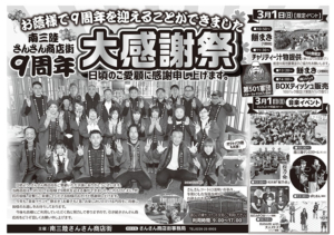 宮城県南三陸町の南三陸さんさん商店街は、3月1日に9周年記念大感謝祭を開催します。音楽イベントや餅まきなどを繰り広げ、節目当日の3日まではセールを展開します。