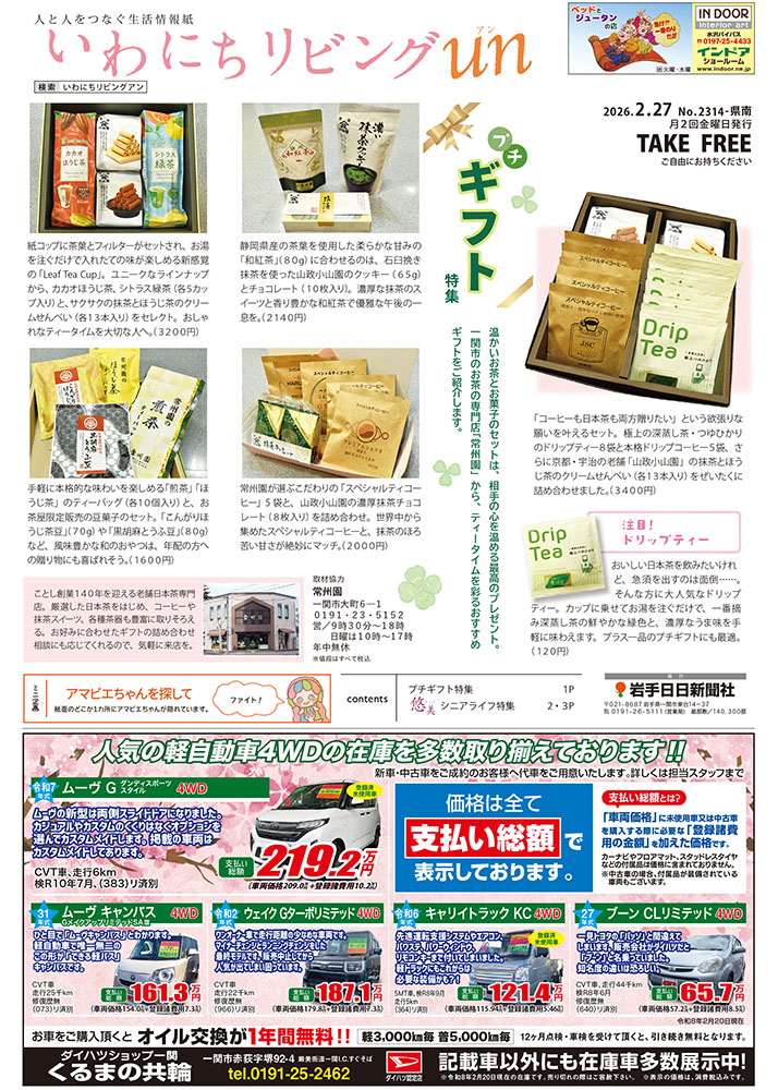 いわにちリビングun 2/27号発行しました♪ 2026 2/27 お知らせ 2026.02.27 紙面スタイルはこちらをクリック♪ 今回の特集は2本立て! 【プチギフト】温かいお茶とお菓子のセットは、相手の心を温める最高のプレゼント。一関市のお茶の専門店「常州園」から、ティータイムを彩るおすすめギフトをご紹介します。 【シニアライフ】人生100年時代の今、シニアライフを自分らしく快適に過ごすための情報を紹介します。 お知らせ いわにちリビング 岩手県 この記事が気に入ったら フォローしてね! Follow @najotta_news Follow Me よかったらシェアしてね! URL Copied! URL Copied! いわにちリビングun2/13号発行しました♪ 関連記事 日常使いでおしゃれな波佐見焼のショップ C.P.D. 2026.01.01 大谷選手ミュージアム風ショップ 10月9~14日、盛岡駅ビルフェザンで 2024.10.08 かわいい動物に会いに行こう! お盆期間は休まず営業 岩手サファリパーク 2025.07.12 いわにちリビングun 5/30号発行しました♪ 2025.05.30 蔵造りでクラシックな雰囲気とともに 手作りのオリジナルスイーツを味わって 蔵まちcoffee はーでぃ・がーでぃ 奥州 2025.09.16 「うみうまキャプテン」戸塚純貴さん 新CMはパネル姿で 2024.08.19 花ことば アステリア 2022.10.25 和洋中、幅広いラインナップ 予約も大歓迎 ホテル松の薫一関 レストラン赤煉瓦 2026.01.19