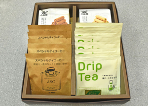 「コーヒーも日本茶も両方贈りたい」という欲張りな願いを叶えるセット。極上の深蒸し茶・つゆひかりのドリップティー8袋と本格ドリップコーヒー5袋、さらに京都・宇治の老舗「山政小山園」の抹茶とほうじ茶のクリームせんべい(各13本入り)をぜいたくに詰め合わせました。(3400円)