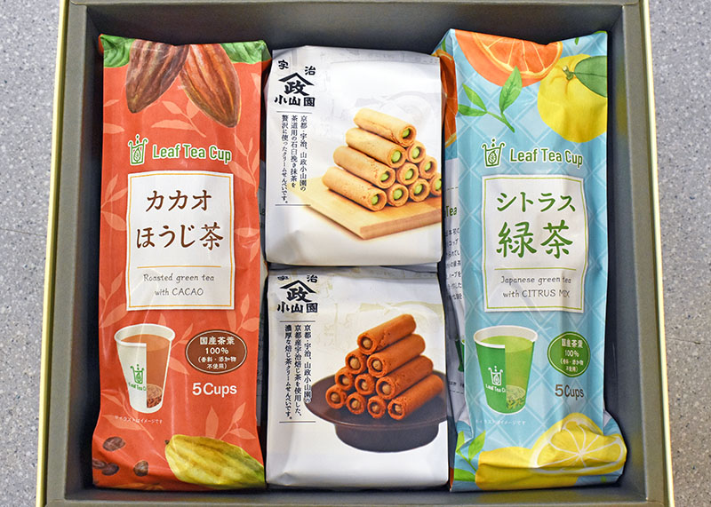 紙コップに茶葉とフィルターがセットされ、お湯を注ぐだけで入れたての味が楽しめる新感覚の「Leaf Tea Cup」。ユニークなラインナップから、カカオほうじ茶、シトラス緑茶(各5カップ入り)と、サクサクの抹茶とほうじ茶のクリームせんべい(各13本入り)をセレクト。おしゃれなティータイムを大切な人へ。(3200円)