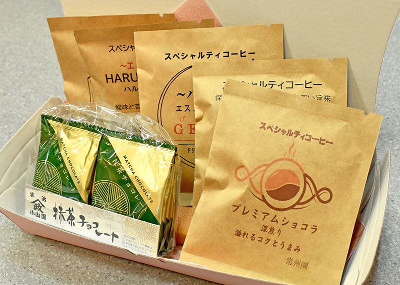 常州園が選ぶこだわりの「スペシャルティコーヒー」5袋と、山政小山園の濃厚抹茶チョコレート(8枚入り)を詰め合わせ。世界中から集めたスペシャルティコーヒーと、抹茶のほろ苦い甘さが絶妙にマッチ。(2000円)