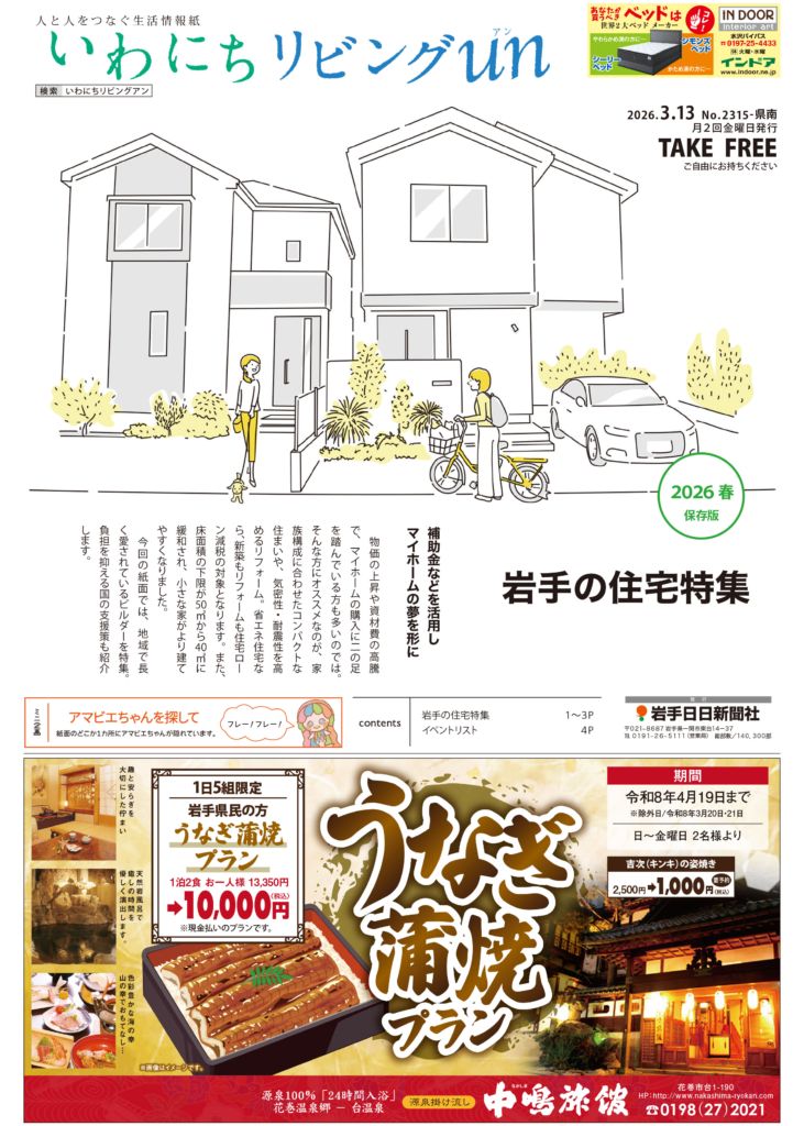 いわにちリビングun 3/13号発行しました♪ 2026 3/13 お知らせ 2026.03.13 紙面スタイルはこちらをクリック♪ 補助金などを活用し マイホームの夢を形に―。 今回は「岩手の住宅特集」。地域で長く愛されているビルダーのほか、負担を抑える国の支援策も紹介します。 お知らせ いわにちリビング 岩手県 この記事が気に入ったら フォローしてね! Follow @najotta_news Follow Me よかったらシェアしてね! URL Copied! URL Copied! いわにちリビングun 2/27号発行しました♪ 関連記事 イオンモール盛岡にじゃじゃ麺専門店 HOT JaJaがオープン! 2022.05.16 大谷翔平選手が雪肌精をプレゼント 新CM、2月10日から放送 2025.02.09 絵本「トットちゃんの 15つぶの だいず」発刊 柏葉幸子さんが紡ぐ新たな物語 2023.08.01 スノーピーク 陸前高田 キャンプフィールド 広田湾の絶景を満喫できる宿泊スポット 2025.03.06 いわにちリビングun 7/21号発行しました♪ 2023.07.21 13日まで日本橋高島屋「大いわて展」 イートインコーナーも復活 2023.03.01 セルフロウリュで「ととのう」 湯の杜ホテル志戸平 大浴場リニューアル 2023.11.18 本場のカレー、日本人好みの味で パナス一ノ関店 2025.05.26