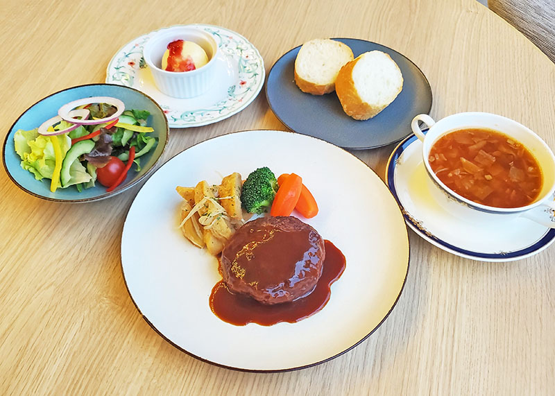 ランチメニューの「きたかみ牛と白金豚のハンバーグ」(1500円)。プラス400円でドリンクバーも楽しめる