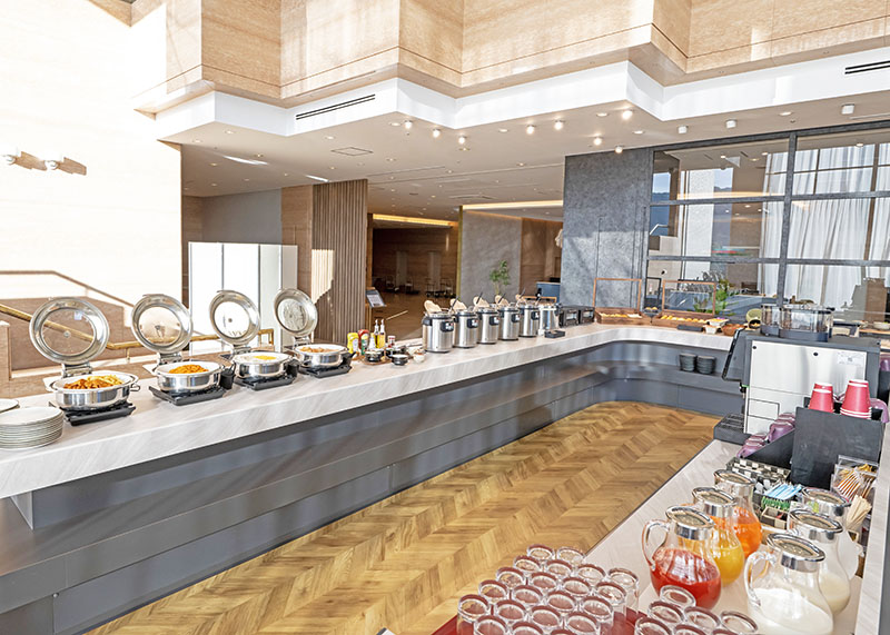 宿泊客以外でも利用できる朝食バイキングやカフェ&バーも人気がある。リビングを見たと伝えると、ランチのドリンクバーが無料になる(3月末まで)。