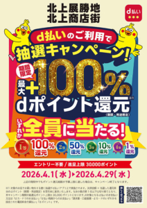期間中に北上展勝地、商店街の対象店舗で「d払い」で支払った人を対象に、抽選で引いた等数に応じたdポイント(期間・用途限定)を進呈。1等は100%ポイント還元、2等は50%、3等は10%、4等は1%と続き、いずれかが全員に当たります。