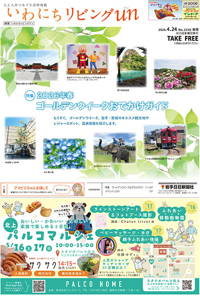 いわにちリビングun 4/24号発行しました♪ 2026 4/24 お知らせ 2026.04.24 紙面スタイルはこちらをクリック♪ 今回の特集は「ゴールデンウイークおでかけガイド」。岩手・宮城のオススメ観光地やレジャースポット、温泉情報を紹介します。 お知らせ いわにちリビング 岩手県 この記事が気に入ったら フォローしてね! Follow @najotta_news Follow Me よかったらシェアしてね! URL Copied! URL Copied! いわにちリビングun 4/10号発行しました♪ 関連記事 地元・東北を舞台に 柚月裕子さん新連載「逃亡者は北へ向かう」 週刊新潮 2023.09.13 初級モデルから憧れの名器まで800台以上展示 10月22・23日、花巻市で「東北管楽器フェスタ」 2022.10.21 格之進×かっぱ寿司 「ハンバーグにぎり」3品、24日まで販売 2024.04.19 自家製生乳100%の優しい味わい MARM ICE CREAM 2025.06.29 選べる本場ジャマイカ・インドのスパイスカレー ジャマイ館 2024.09.26 新鮮、おいしい! 岩手県産カットレタス サラダクラブ期間限定販売 2023.06.22 通いたくなる量り売りの醸造所 315BEER 奥州市水沢 2022.09.11 火を使わないエコクッキング 切干大根のサラダ 2026.02.11